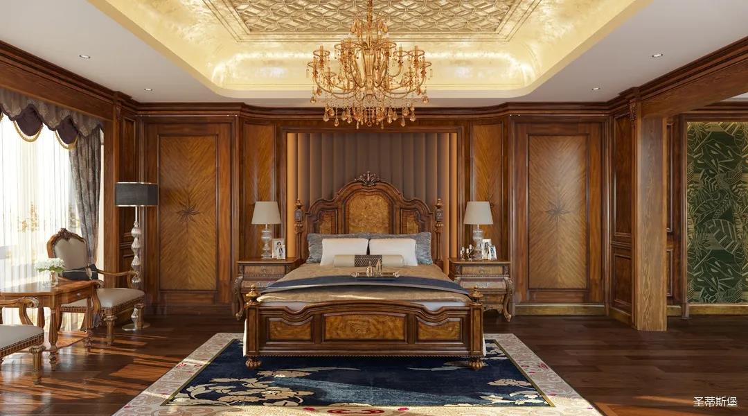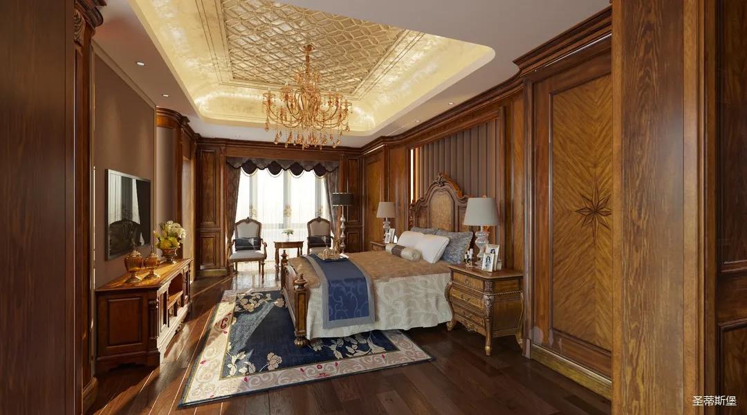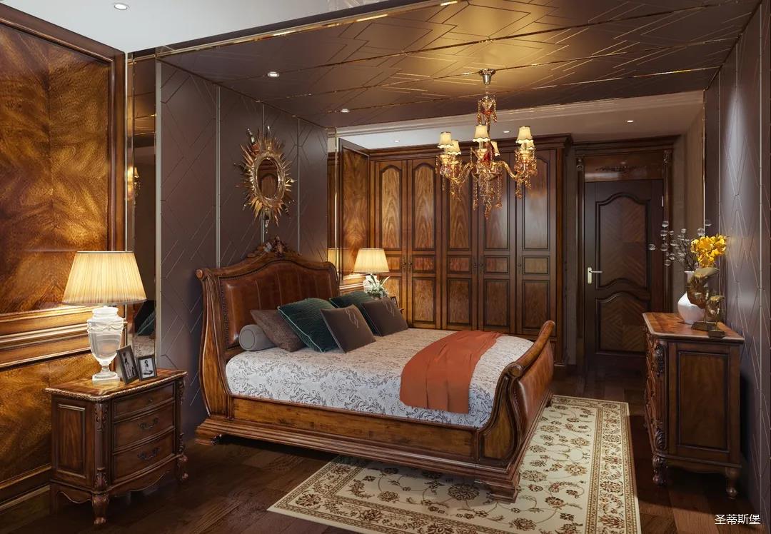 主臥整體設計是美式與現代的完美整合,既保留了純正美式的形和實木雕刻藝術,又具有濃重的美式配色,濃濃的藝術氣息不自覺在浪漫的美式空間流淌。流暢的弧線花飾以及豐富的木作線條別具匠心。大氣穩重與舒適雅致并重,并借由開放的布局、靈活的動線,共同促成了整個空間極具復古浪漫的情調。