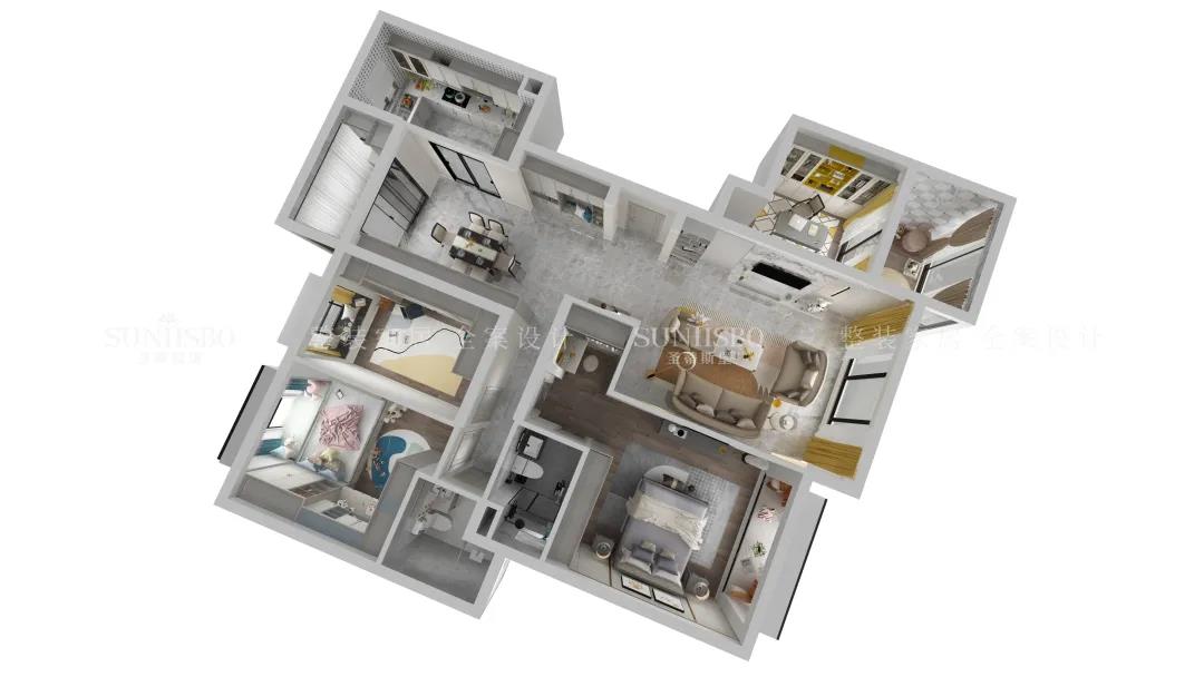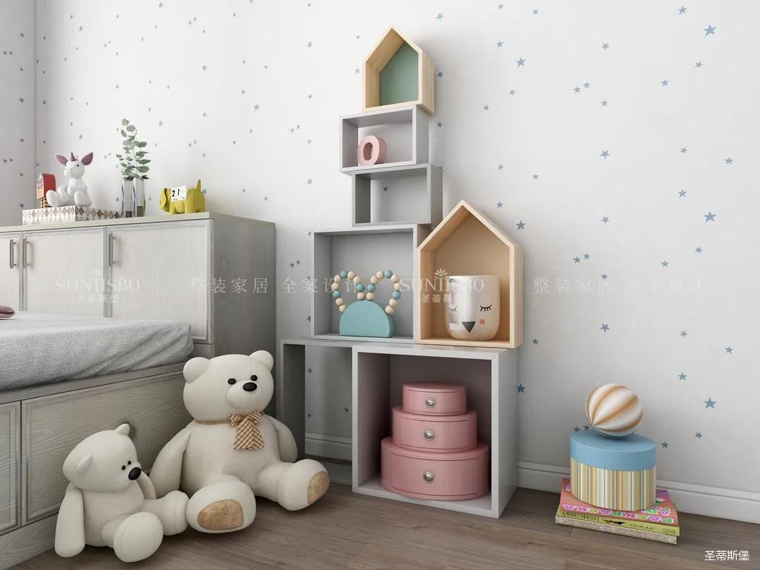 兒童房摒棄了傳統(tǒng)榻榻米的呆板與嚴(yán)肅,延續(xù)主臥輕奢雅致的空間氛圍,以木質(zhì)為主材質(zhì),利用面板的線(xiàn)條帶來(lái)視覺(jué)上的延伸,將童趣與理性相融表現(xiàn)兒童應(yīng)有的學(xué)習(xí)氛圍與生活習(xí)慣。開(kāi)放式展示區(qū)應(yīng)用藍(lán)色點(diǎn)綴,再次強(qiáng)化了空間專(zhuān)屬兒童的活躍格調(diào),也呈現(xiàn)了設(shè)計(jì)師在材質(zhì)與色彩運(yùn)用上的精細(xì)與專(zhuān)業(yè)。