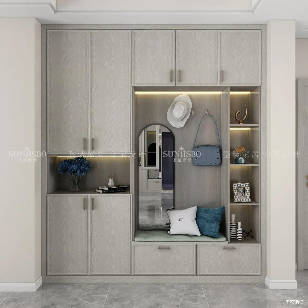 衣帽間是女主特別要求的,設(shè)計(jì)是將房間打造成衣帽間系統(tǒng),采用L型布局,壁掛式設(shè)計(jì),讓穿搭動(dòng)線(xiàn)更順暢,視覺(jué)上也更通透,可直觀的展示女主人穿搭品味。玻璃層板與背板花色的結(jié)合,精致靈動(dòng),成為時(shí)尚與輕奢的寫(xiě)照,封閉區(qū)衣柜的合理格局規(guī)劃,完美詮釋現(xiàn)代輕奢風(fēng)于當(dāng)代定制中的前瞻性。