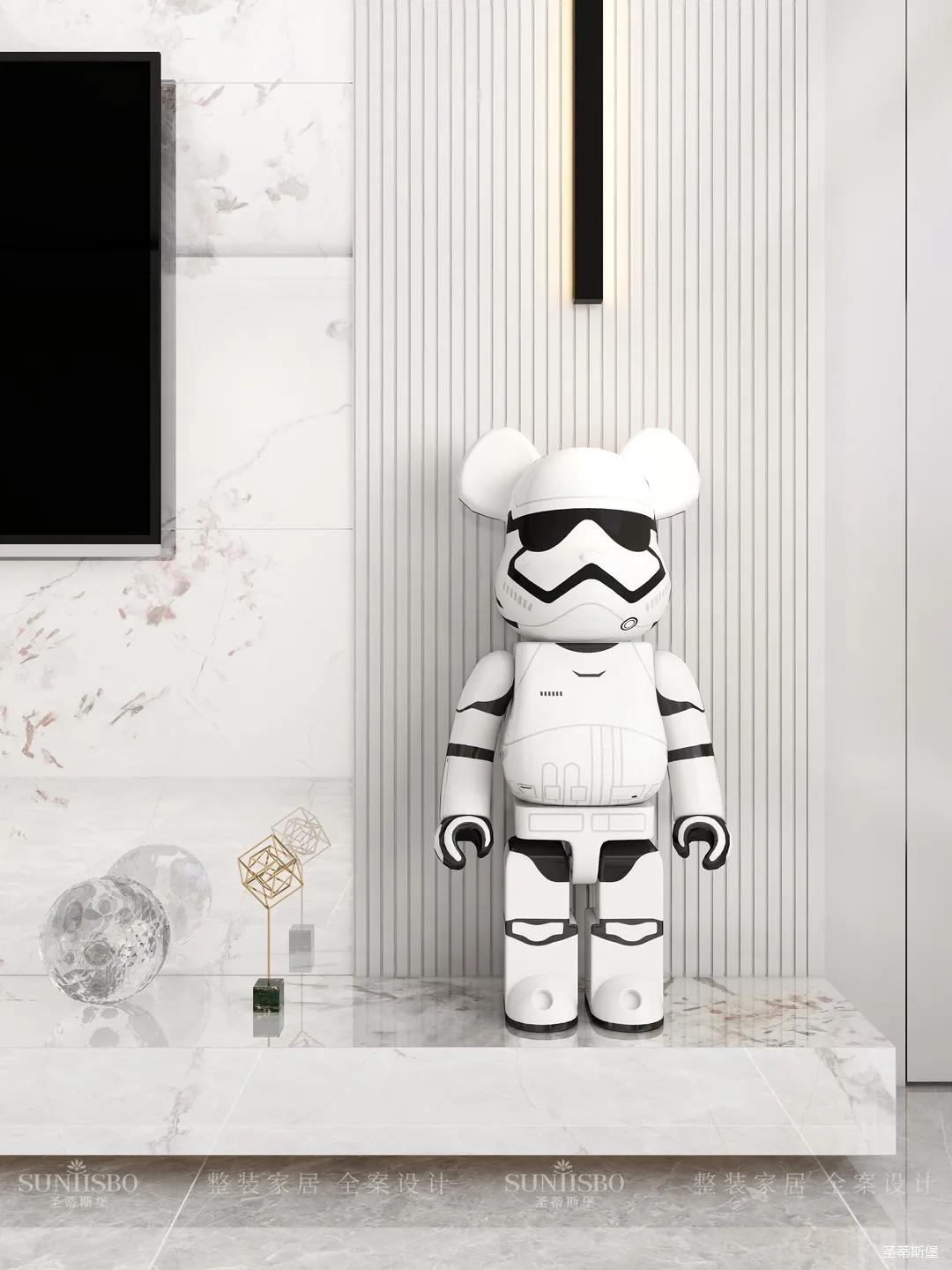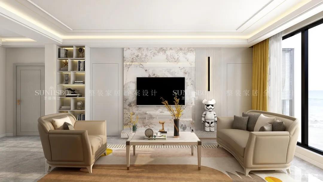 客廳設(shè)計(jì)置頂展示柜和大理石,實(shí)現(xiàn)了現(xiàn)代和輕奢風(fēng)格間的均衡組合。溫柔莫蘭迪色調(diào)的沙發(fā),細(xì)節(jié)的實(shí)木底座和人性化的環(huán)抱式設(shè)計(jì)讓空間更添溫馨的氣息。