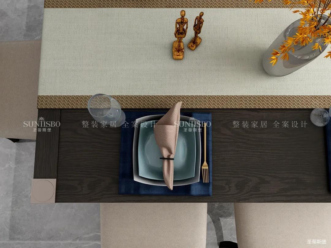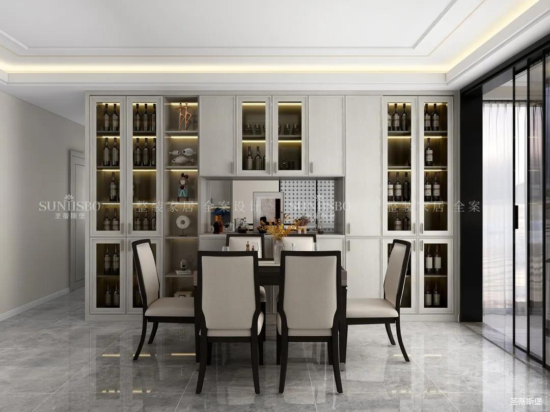 餐廳和客廳以大橫廳的形式展開(kāi),設(shè)計(jì)師將實(shí)木、玻璃、皮質(zhì)、金屬等看似相互排斥的元素相互重組,讓餐廳呈現(xiàn)多元式的輕奢氛圍。深淺色彩,對(duì)稱(chēng)型的定制柜,都讓空間形成強(qiáng)有力的質(zhì)感對(duì)比。無(wú)論是午餐窗外的車(chē)水馬龍,還是晚宴的點(diǎn)點(diǎn)繁星,都能給屋主帶來(lái)良好的就餐體驗(yàn)。