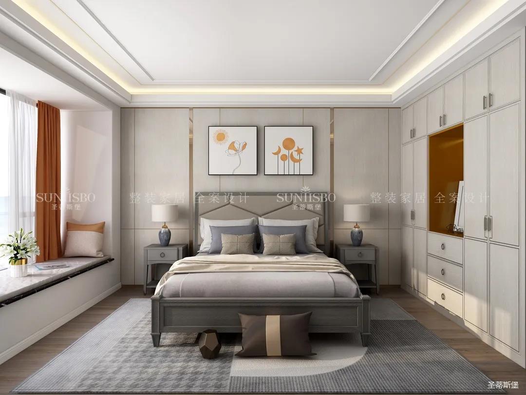 主臥隨著優(yōu)雅的金屬線(xiàn)條鋪開(kāi),臥室內(nèi)的靜謐感有序的傳遞著,帶有溫度的木飾面與溫潤(rùn)的實(shí)木地板在同一空間交匯,充滿(mǎn)輕奢質(zhì)感。明亮橙的色彩點(diǎn)綴讓空間活躍的格調(diào)不斷擴(kuò)充,仿古白的定制柜體在空間形成若隱若現(xiàn)的視覺(jué)平衡,將溫暖,柔和組合成日常的睡眠氛圍。