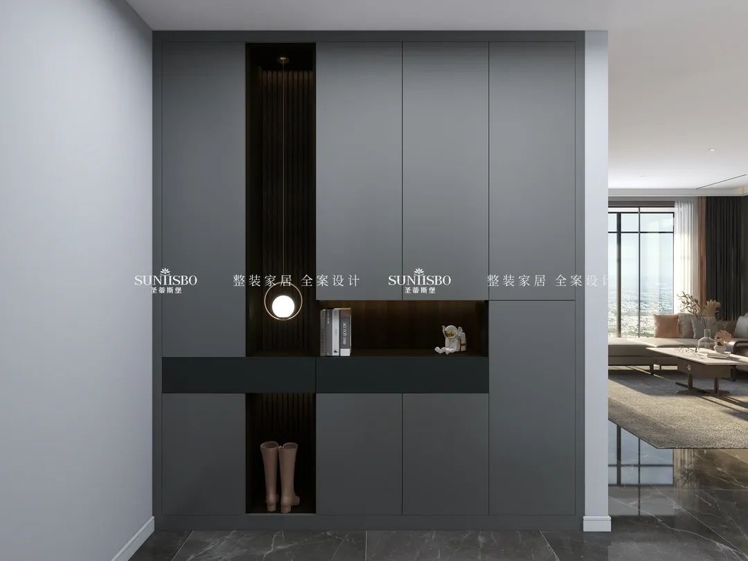 入口玄關處講究極致簡潔,摒棄繁雜的設計元素,地面磚體采用與柜體相近的色調,在界面轉折的地方著重連貫統一,讓入戶空間呈現科技立體感,趣味十足的藝術品擺放,使整體顯得高級又有顏值。在其中通過點狀燈光設計,帶來躍動而富有生命力的視覺焦點,展現出現代時尚感。