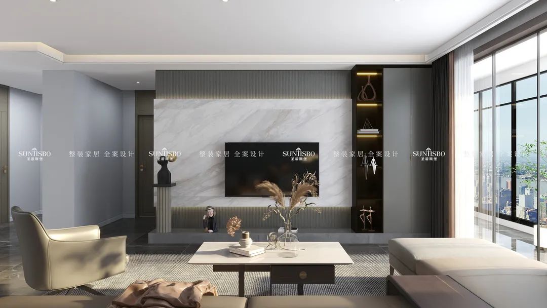 墻面的巖板中帶著絲絲縷縷的輕柔紋理,宛如細水清流,不會過于單調,也不會過分雜亂。木飾面、金屬、石材、棉麻等多變的材質襯托空間。地毯選擇材質比較厚重的灰麻色調,在寬敞的客廳中界定了相對柔和的區域,傳遞著隨性、沉穩而不失品質感的生活方式。
