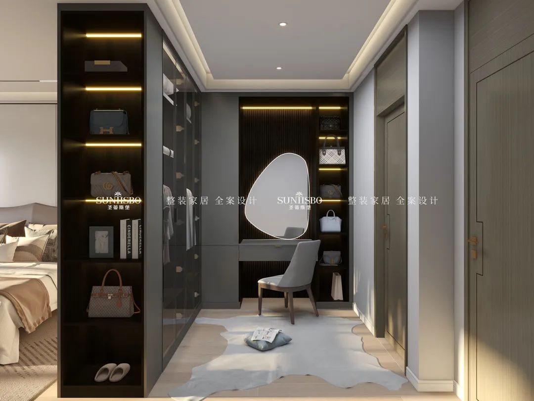 擁有一個專屬衣帽間是很多女生的夢想。設計師回歸生活本質,究其外,是空間;究其內,是材質、燈光,內外融合,比例和諧。通過不規則狀的玻璃鏡面設計,在時尚高級的定制空間中,傾訴著創意的真實和溫度,不僅擴大了衣帽間視覺范圍,同時也給予了空間個性鮮明的藝術格調。