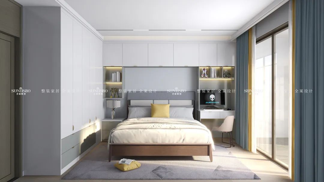 原色的木地板、淺灰的衣柜,搭配簡約的背景墻,整個空間都呈現著祥和靜謐的氛圍。游走的光影,絕佳的開闊視野,使得空間充滿無限張力。黃綠拼接的窗簾,配合柔和的層板燈,營造舒適溫馨的起居氛圍。